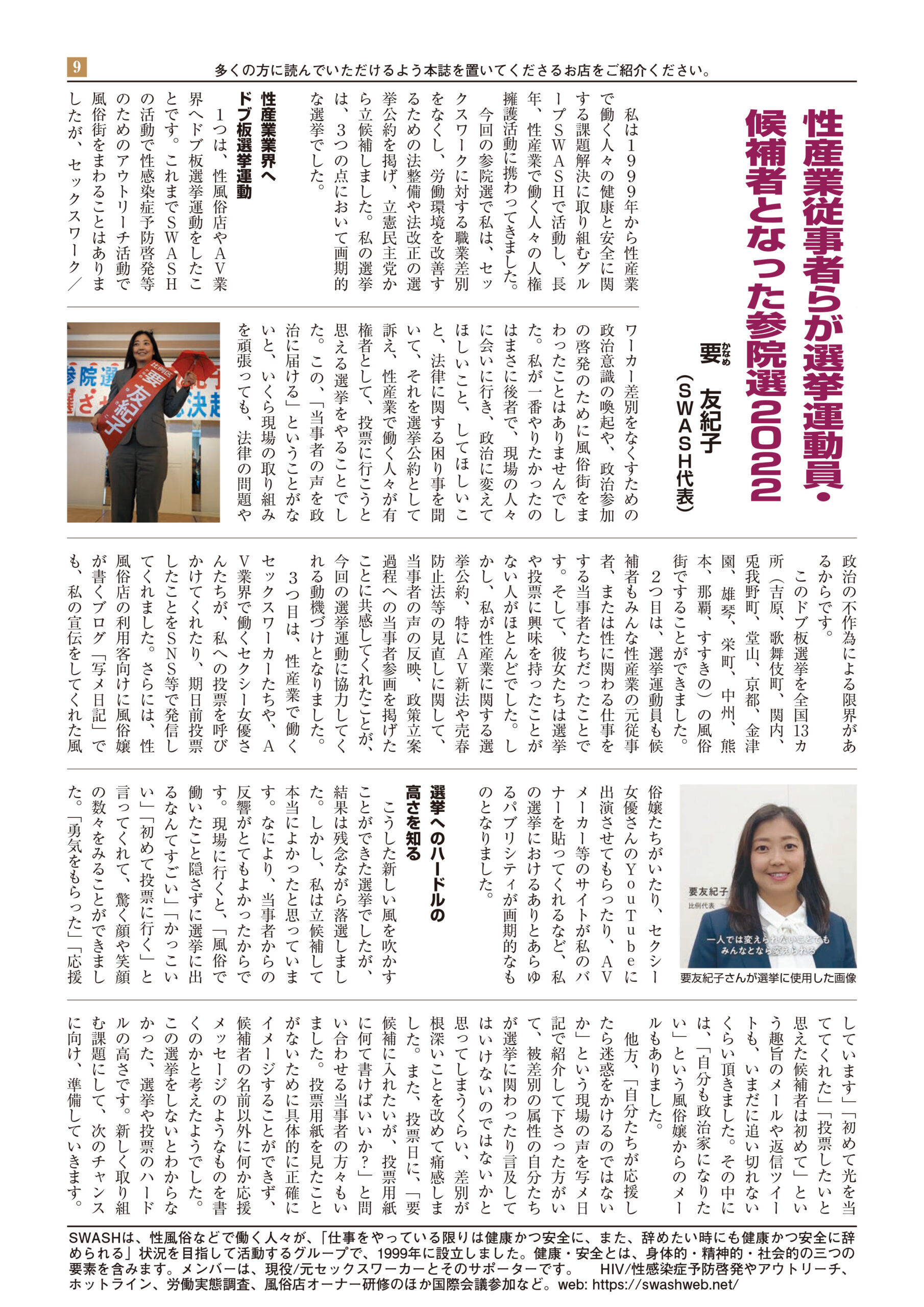 - 「セックスワーカーを含むすべての人の尊厳を守れ SWASH代表・要友紀子氏インタビュー」紙の爆弾2020年8月号、p.32-37(単独インタビュー記事掲載)