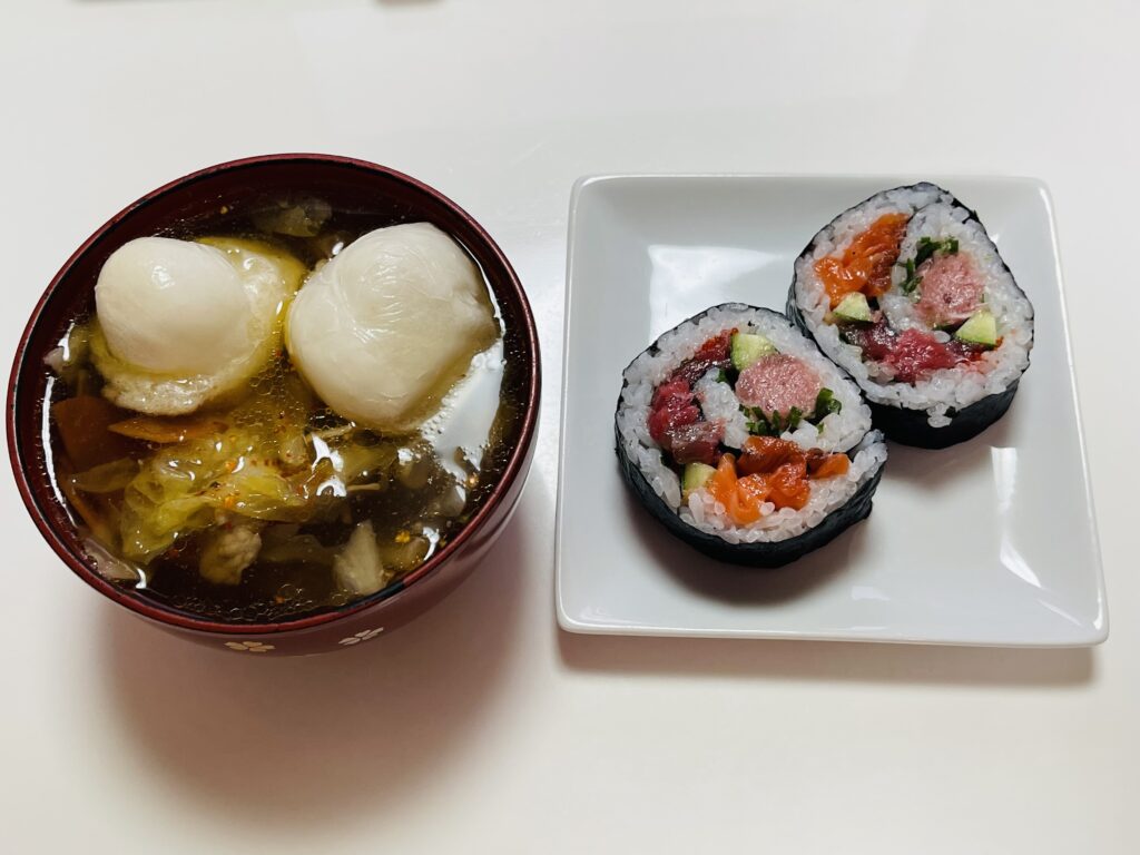 2日にお雑煮を作って、スーパーで590円の巻き寿司を買って食べました。